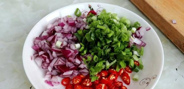 一直把花生炸到微微变色,有噼里啪啦声响的时候关火后控油捞出来,然后把花生晾凉备用2、接下来把红尖椒切小圈、小葱切葱花、把洋葱切成小丁