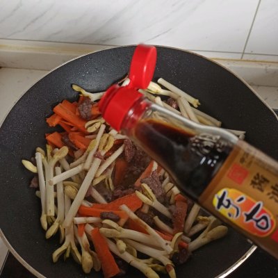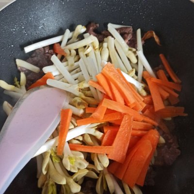 5、加入花生芽和胡萝卜翻炒一下,