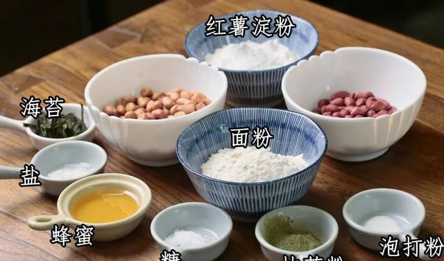 红薯淀粉60g/面粉60g/泡打粉0.5g盐3g/糖3g/水40g/蜂蜜25g抹茶粉3g/海苔碎10g