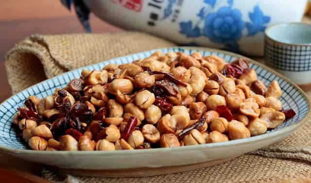 花生200g/白酒30g盐10g/糖5g/白醋10g八角/香叶/干辣椒/青花椒适量