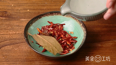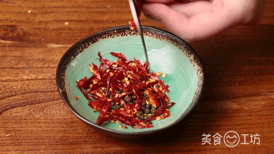 2. 干辣椒剪碎,与青花椒、八角、香叶一块儿用白酒浸泡20分钟,而后捞出沥干。