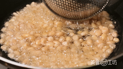 3. 油温烧至7成热,将冻花生米倒入锅中,油炸至金黄后捞出,不要炸太久,免得炸糊掉。
