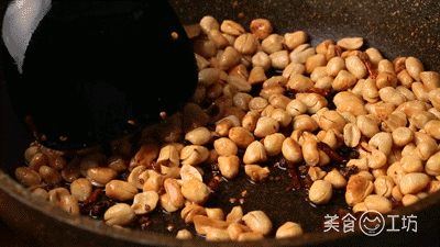 5. 倒入花生米快速翻炒,可加入少许泡香料的白酒提香,加入白糖和盐,翻炒均匀即可出锅。
