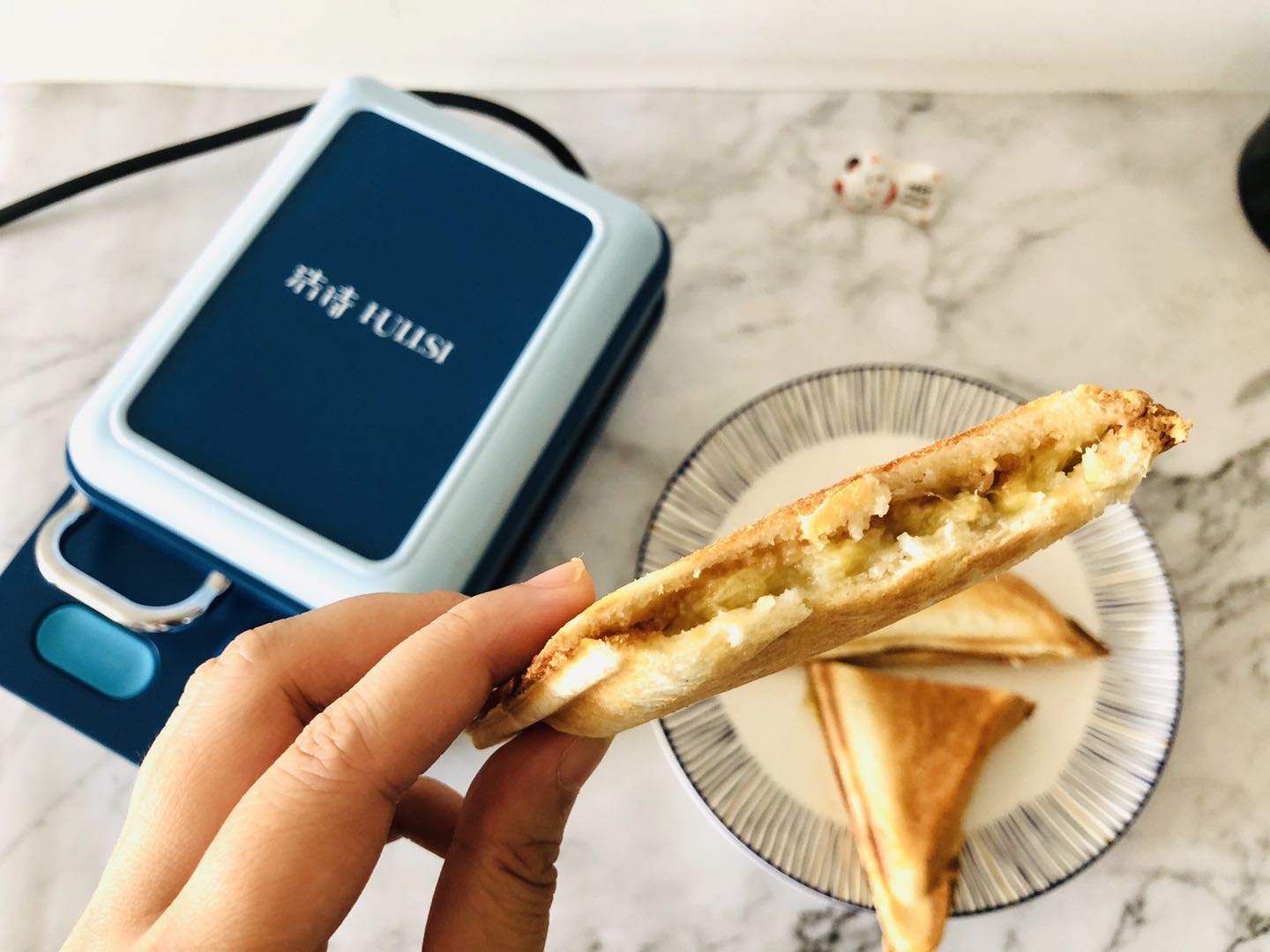 把一片吐司放入预热好的三明治机,抹上一层咸味花生酱,再放上新鲜的香蕉切片,最后盖上一片吐司,加热3分钟就可以吃了。