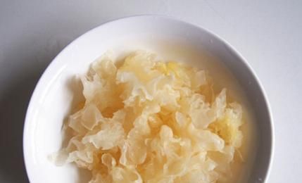 第二步:准备一半的银耳,放在清水里浸泡1小时左右,银耳洗发后,将银耳撕成小圈,放在碗里,注意:白耳一定要一夜不起泡,因为白耳和木耳是一样的,浸泡两小时产生有害细菌,吃过久浸泡液体的银耳严重的可能出现中毒现象,关于这一点,请大家注意。
