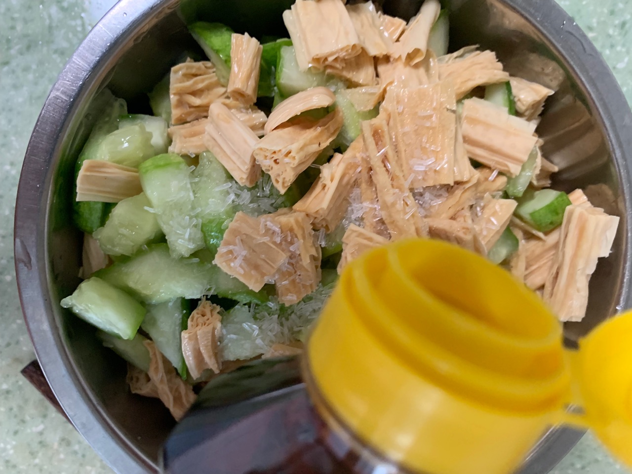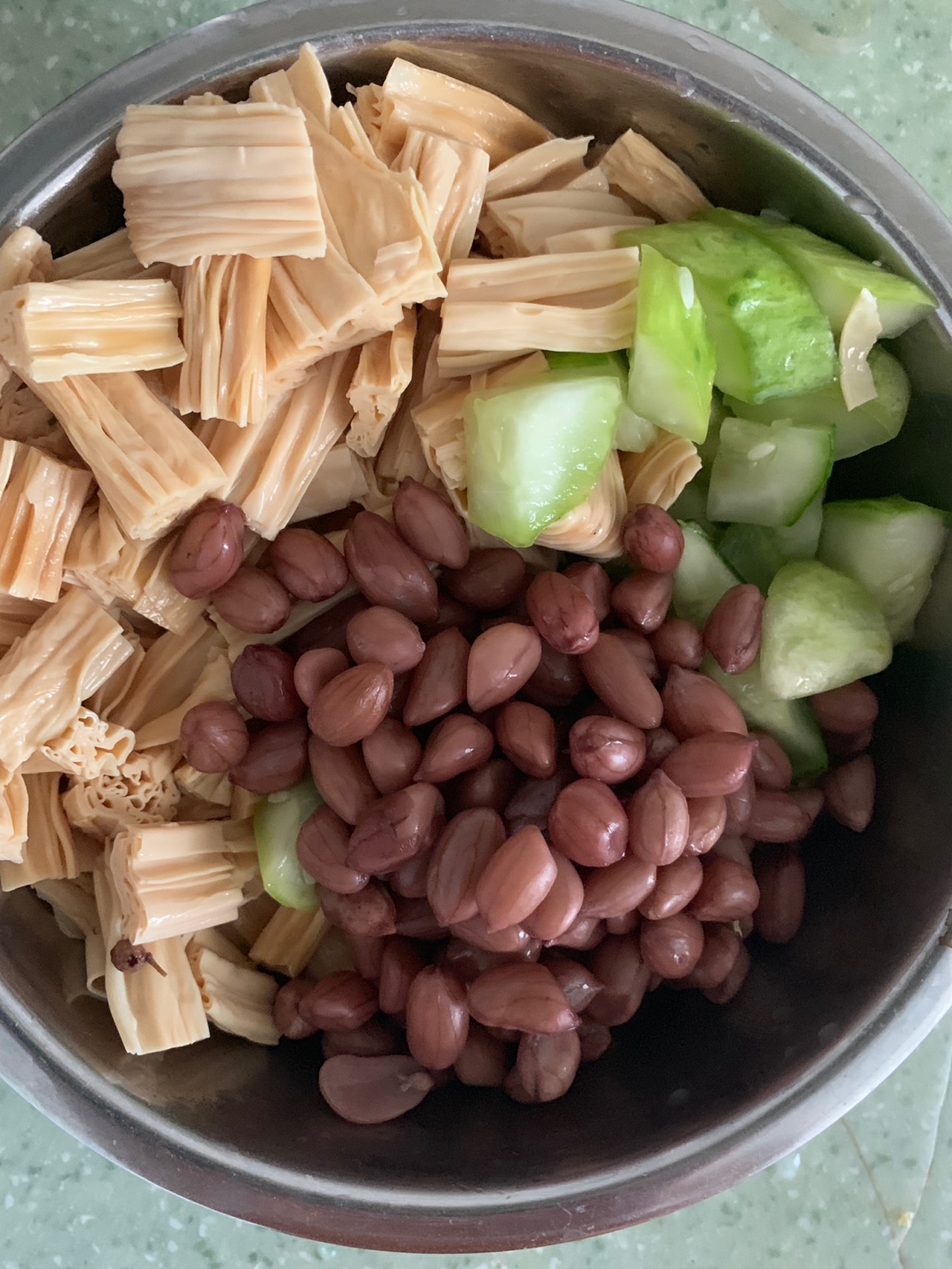 之后把案板上的腐竹和花生米都放入装有黄瓜的盆子里面,把它们三混合起来。