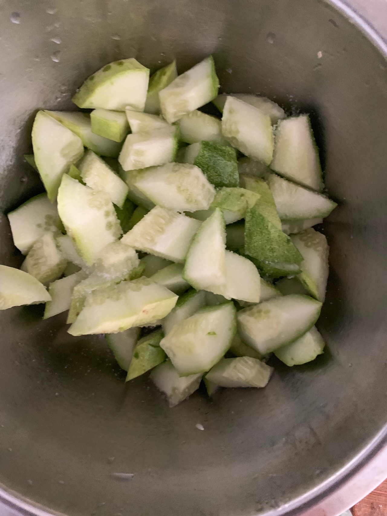切好的黄瓜放在盆里面,然后撒入一些食盐开始腌制,等到一段时间以后,将黄瓜被盐杀出水分倒掉。