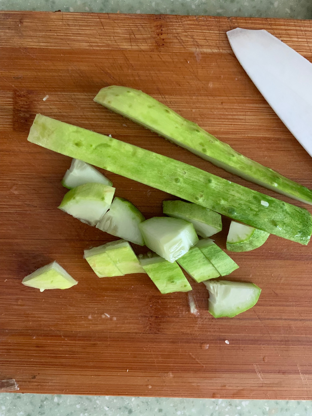 黄瓜拿到水池淋水洗净,然后拿刀切成小块,就如上图显示的一样。
