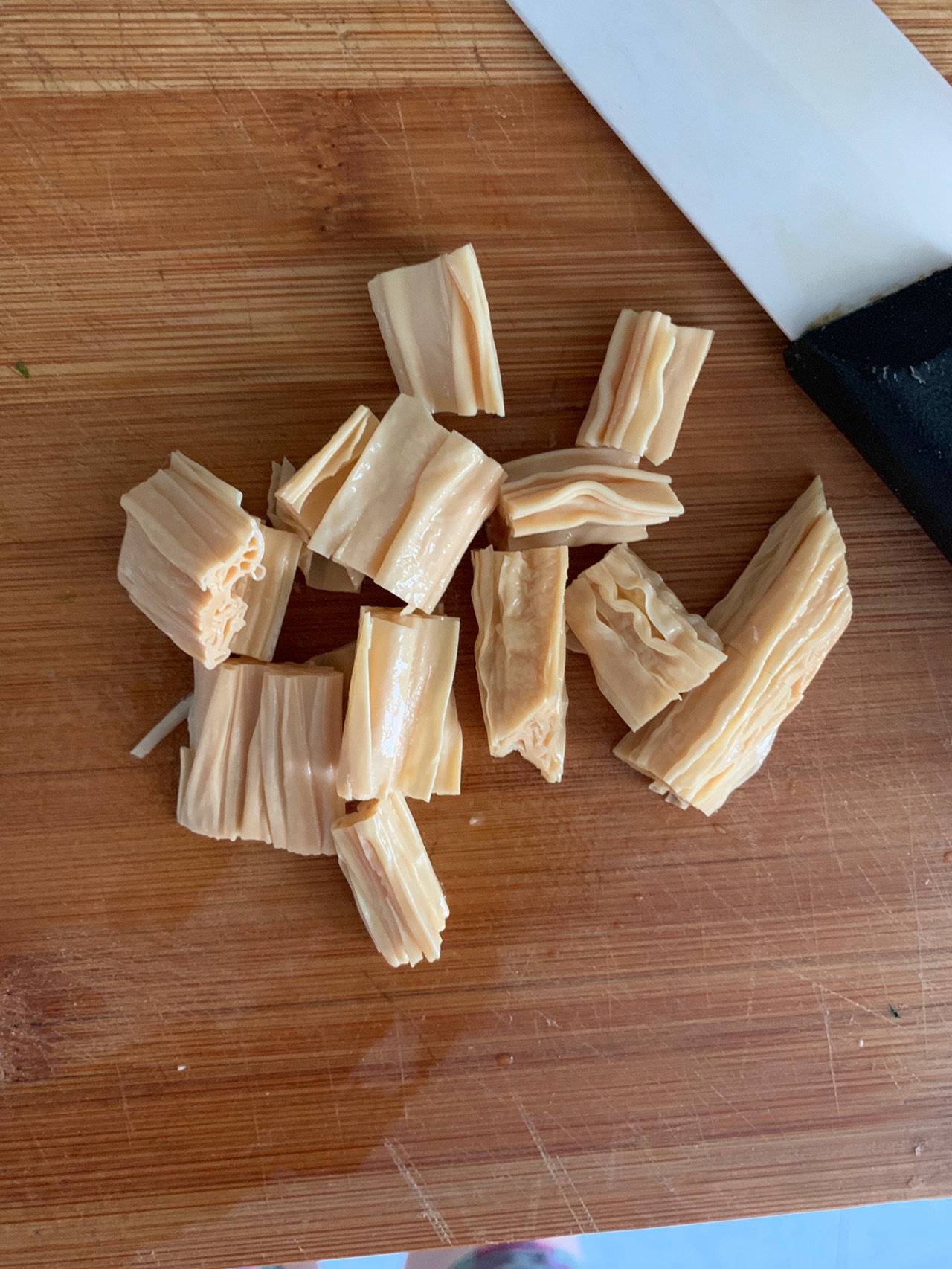 腐竹泡好以后放在案板上,用刀切成小段状,以待之后使用。