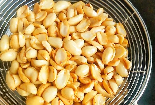 小火油炸至花生米完全熟透,并带微微变黄的色泽,就可以从油锅中捞出沥油了。