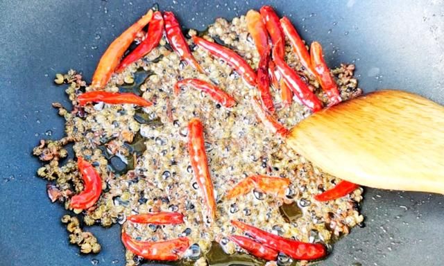 锅里留下少许底油,烧热后,放入干辣椒和花椒粒,小炒出浓郁的辛辣味。