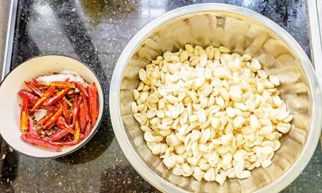 浸泡了一个晚上的花生米,再想办法把花生皮脱去,并从花生米正中间掰开成一分为二,如此操作能够增加花生米的入味效果。