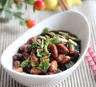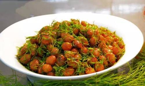 用料:花生仁(炒)500克、香菜2棵、江米酒20毫升、香醋60毫升、白糖10克、食盐2克、植物油50克
