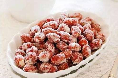 1、生花生米泡开水中10分钟,去掉外表的红衣,锅中注入植物油,将去红衣的花生米冷油下锅,小火慢慢炸至酥脆,盛出沥干晾凉备用;