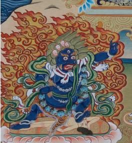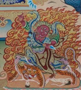 是莲花生大师的忿怒化现,译为金刚力士。一面二臂三目,身体呈棕红色,面相忿怒,三目圆睁,张开大口,獠牙锋利,右举天铁金刚杵,左持普巴撅,骑于母虎之背,虎足下踏两魔,象征消除一切违缘障碍,降服一切魔障。威立于莲花日轮之上,安住般若烈焰之中。莲花生大士降伏了奸臣之子,国王将其流放到尸陀林。他在不同的尸陀林中,为人说法,对那些无缘佛法,有着邪知邪见的鬼神,以忿怒金刚的形象全部降伏。
