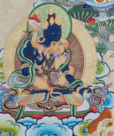 身现蓝色,拥抱白色明妃,金刚盘腿坐姿,明妃左手托装满甘露的颅碗,双脚缠绕父尊。藏史云:印度西方邬丈那国,国王因扎菩提膝下无子,因其乐善好施,不时供养三宝,故国库空虚,派国中大臣兹拉尊往海中寻宝,于达喇郭啸海见莲师降生于莲花上,将之抱回由国王抚育为太子,赐名为“莲花生”或“海生金刚”。