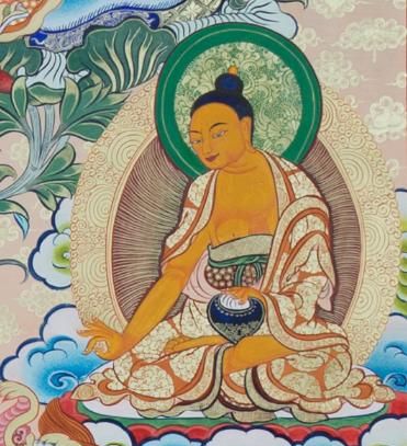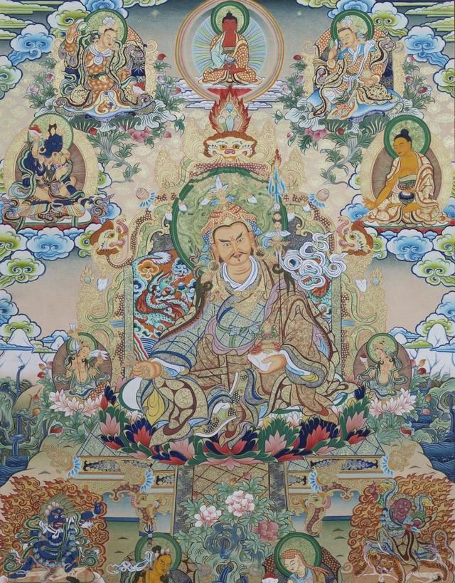 唐卡正中主尊:莲花生大师,他是藏密的开基祖,亦是藏传佛教宁玛派的祖师。身侧左右为莲花生大师的两位佛母曼达拉娃,益西措杰。