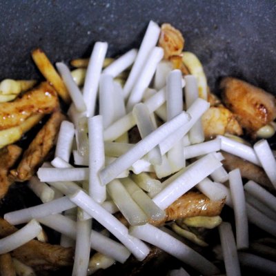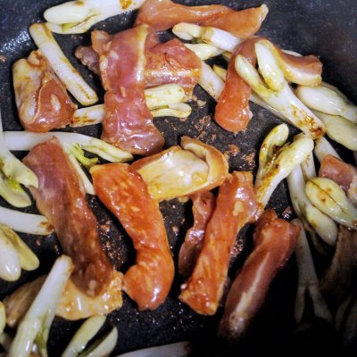 3、⑤再倒入猪板筋摊开,煎好一面再翻炒 ⑥倒入10克料酒盖盖焖2分钟