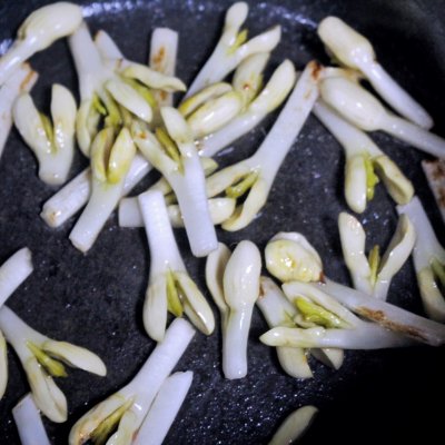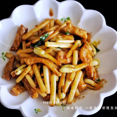 2、②花生芽切成小段,把芽部和根部分开 ③猪板筋加入酱油和少许淀粉拌匀 ④油锅里倒入花生芽的芽部先炒