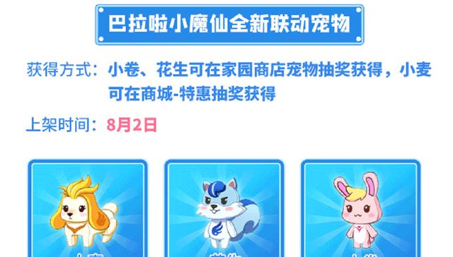 小麦、花生和小卷虽然是同时上架的,但是入手的途径也是有着一定的区别,就以小卷和花生为例,这两个小宠物需要在家园商店中抽奖获得,也就是需要玩家凭借着运气抽出自己喜爱的宠物。不过按照这次联动的稀有度,想必会有不少玩家前往买单,不过能不能抽中就看大家是不是欧皇了,运气好的话单抽入魂也说不定。