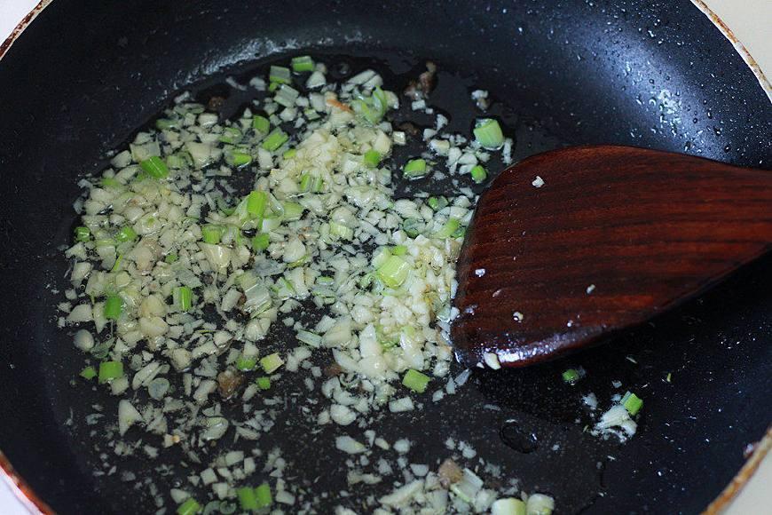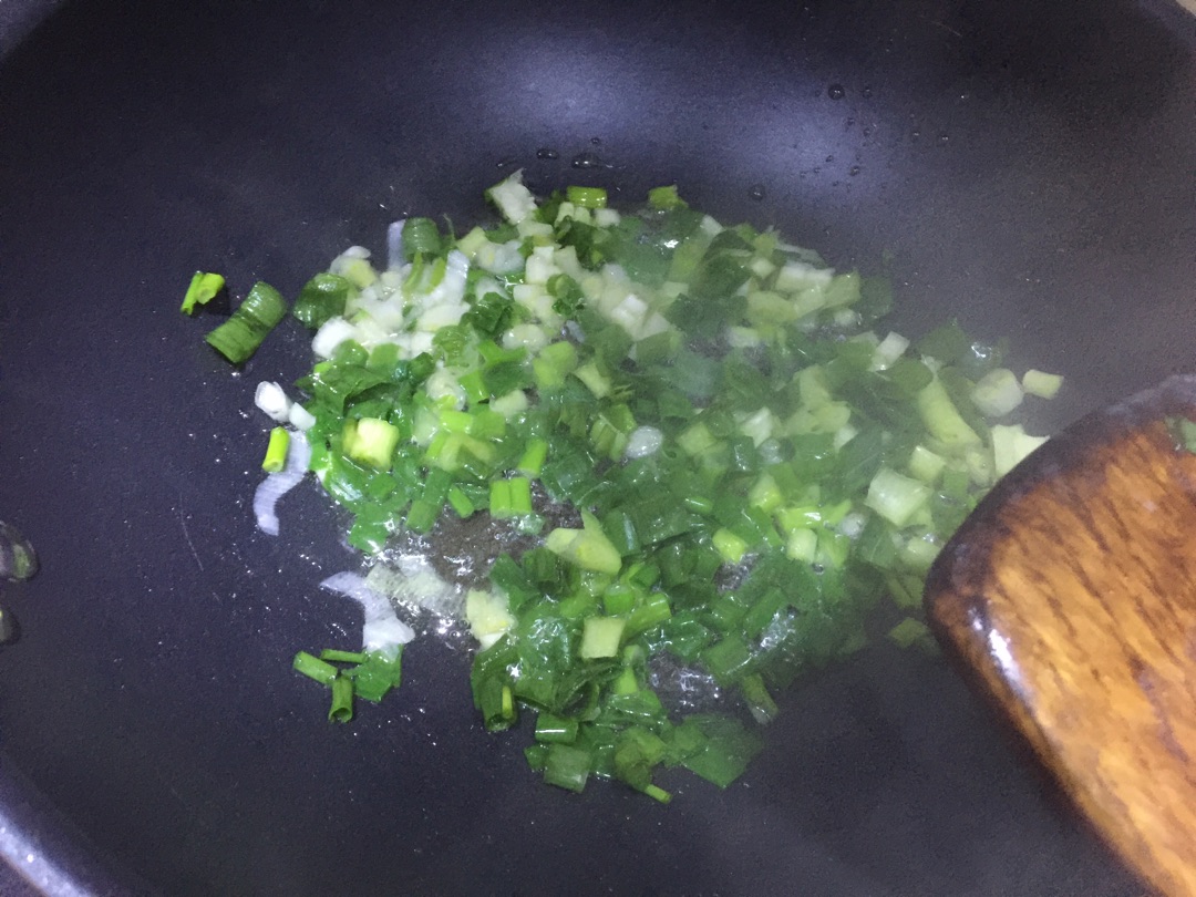 把锅中倒入一锅底的食用油煮开,再倒入葱花,加入盐炒香(因为我们家不习惯吃生盐,其实葱花也可以不用炒,直接拌)