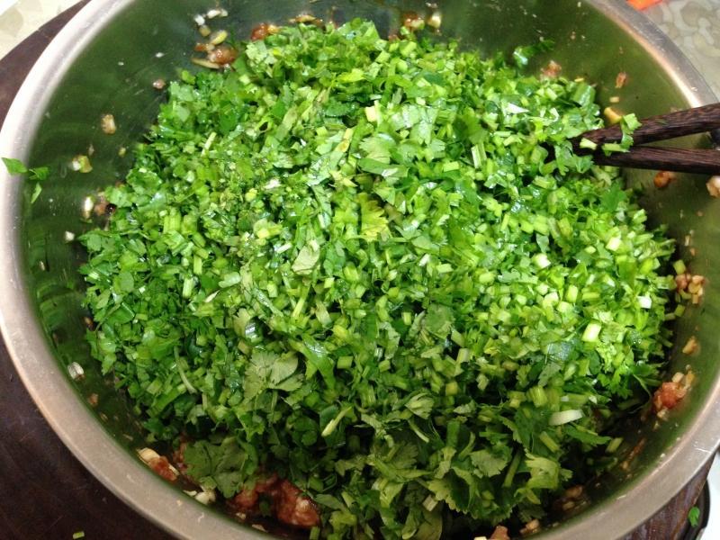 把香菜用刀切成碎末状,如上图。(一定要切得非常细碎,制作出来的菜肴吃起来口感才会更好)