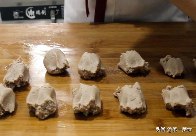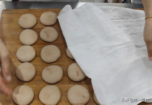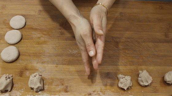 把面剂子在手心处团成圆球,然后放在案板上摁扁,花生饼的生坯就做好了。