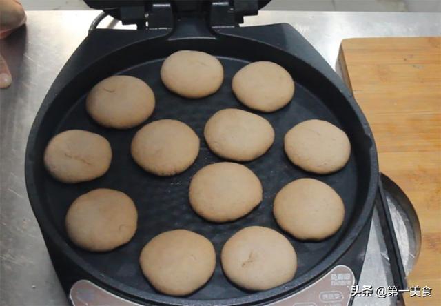 电饼铛预热2分钟,把生坯依次摆放在锅中,盖上锅盖烙2分钟,饼周围变色时翻面,翻过来之后再烙2分钟。
