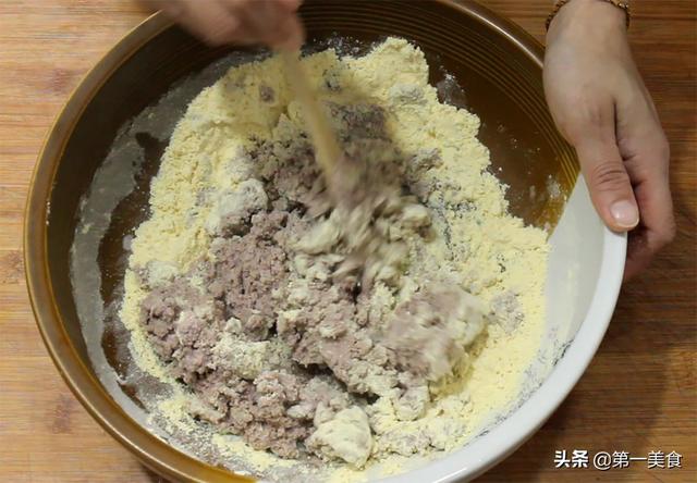 打好之后,把花生泥倒入盆中,趁热加入玉米面180克和花生泥掺匀,玉米面趁热放进去才能被烫熟,口感会更加清甜。